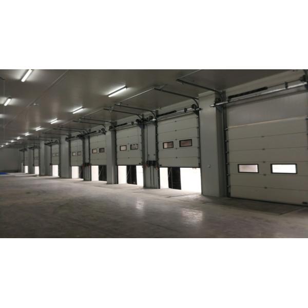 Industrial sectional doors, the door panel is made of double-layer sandwich hot-dip galvanized steel plate with surface polyurethane process, the core material is polyurethane insulation and thermal insulation layer, the thickness is 40mm. The end face of the door body is provided with a box-shaped edge banding, and the connecting hinge is mounted on the edge banding, so that the door body is embedded track. The top and bottom sealing strips and lateral sealing strips made of spherical vinyl resin along the width and height of the door are fixed on the bottom and the top to prevent wind, rain and penetration. The door body balance system is composed of torsion spring, reel, steel shaft and locking and fixed flange. The wheel is wrapped with steel, and the steel cable is connected to the steel cable breaking device at the bottom of the door. There- fore, it is also convenient to lift the door body without a motor in a balanced state